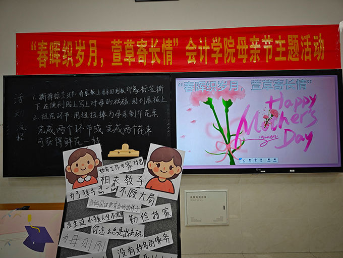 为进一步强化学生思想道德建设,弘扬中华民族孝亲敬长的传统美德,让同学们勇敢抒发对母亲的爱意与祝福,5月8日下午,会计学院“春晖织岁月,萱草寄长情”母亲节主题活动在商科楼举行,通过多元形式让同学们感受母爱、...