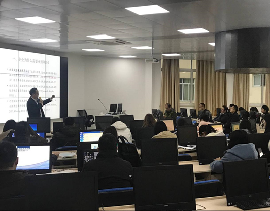 讲座中刘教授以企业为什么需要承担风险为起点,就企业风险承担研究的理论演进与研究进展以及未来研究的若干思考向全体教师做了详细的介绍。整个讲座持续近三个小时,李教授整个讲解过程深入浅出、引经据典,老师们为他扎实的学术功底和严谨的治学风格所吸引,讲座结束后积极上台围着刘教授提出问题。
