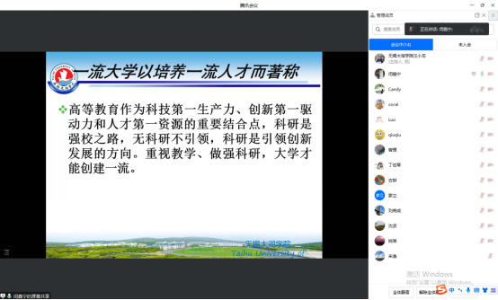 2023年3月17日,无锡太湖学院财管系全体老师第六期学术沙龙在线举行。会计学院闵嘉宁教授进行了题为“建立教学与科研相互促进机制体会”的精彩讲座,并与财管系老师们进行了深入交流讨论。本次沙龙由财管系主任汪小龙主持,刘尧成教授,沈波教授,姚瑶等多位老师线上参与,反响热烈。