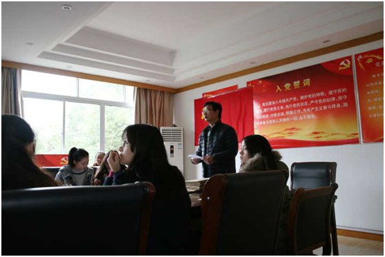 最后,黄贵平老师对本次会议进行了总结,并对新党员提出了要求:严格要求自己,不断提高自我,加强党性修养和提高自身综合素质。黄老师希望大家牢记自己的身份,以身作则,自觉宣传党的政策,树立党的威信,维护党的形象;自觉遵守学校和党组织的各项制度,在学习、生活中充分发挥学生党员的主观能动性和先锋模范作用,做全院同学的好榜样。