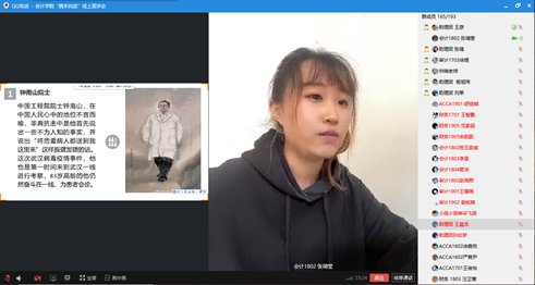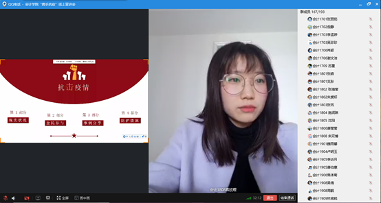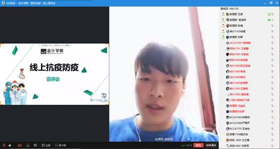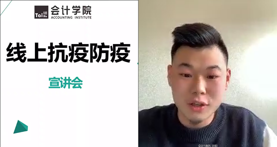 首先由会计学院团总支书记任金晶老师介绍此次宣讲会的主要目的及流程,强调同学们在家应该认真上网课,停课不停学,为接下来的考试做好充分准备,认真遵守上课纪律,做到不迟到、不早退、不旷课,并叮嘱大家疫情期间不能掉以轻心,尽量少出门,服从学校安排。面对当前疫情状况,我校积极响应国家号召,共同参与抗击疫情阻击战中,部署学校防疫,在开学之前做好充分准备。