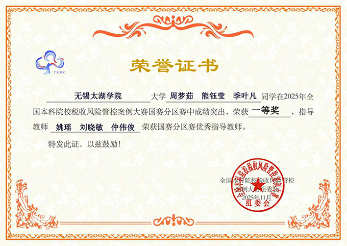 省赛启动后,我校学子踊跃参与校内选拔,一批队伍凭借出色实力晋级省赛,斩获1项一等奖、4项二等奖、2项三等奖。其中,一等奖获奖队伍“税收侦察兵”队由无锡太湖学院会计学院姚瑶、刘晓敏、仲伟俊三位老师共同指导,队员为周梦茹(队长)、熊钰莹、季叶凡,成功晋级全国总决赛。