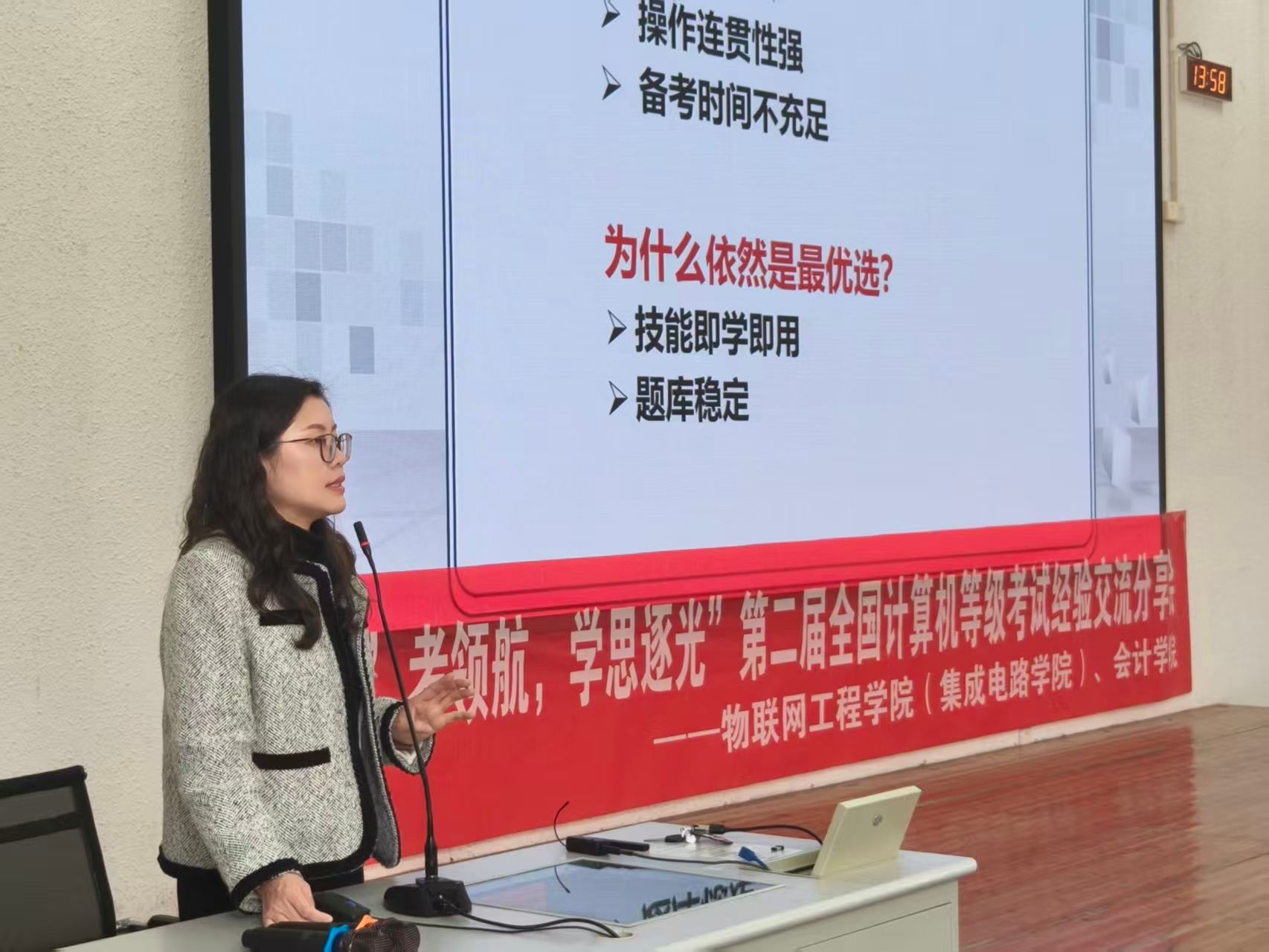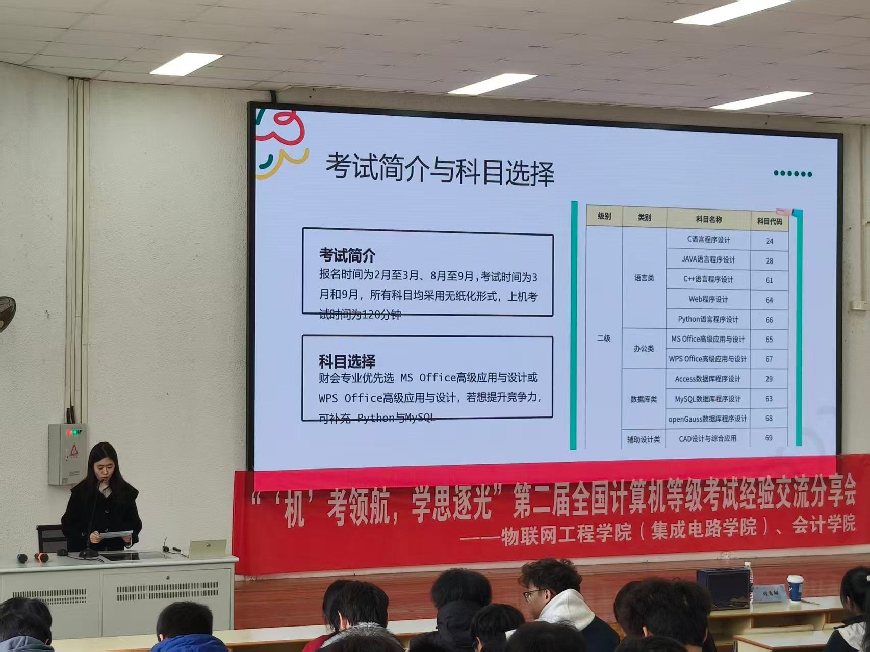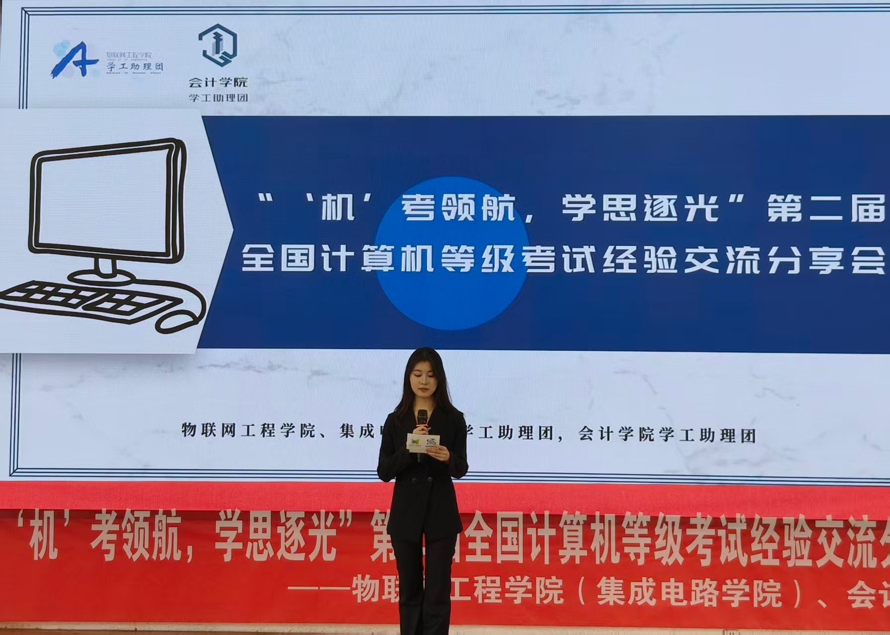 为提高学生计算机二级备考效率,优化备考方法,充分发挥教师引领和朋辈互助作用,物联网工程学院、集成电路学院学工助理团和会计学院学工助理团于3月12日在8-412教室成功举办“‘机’考领航,学思逐光”第二届全国计算机等级考试经验交流分享会。