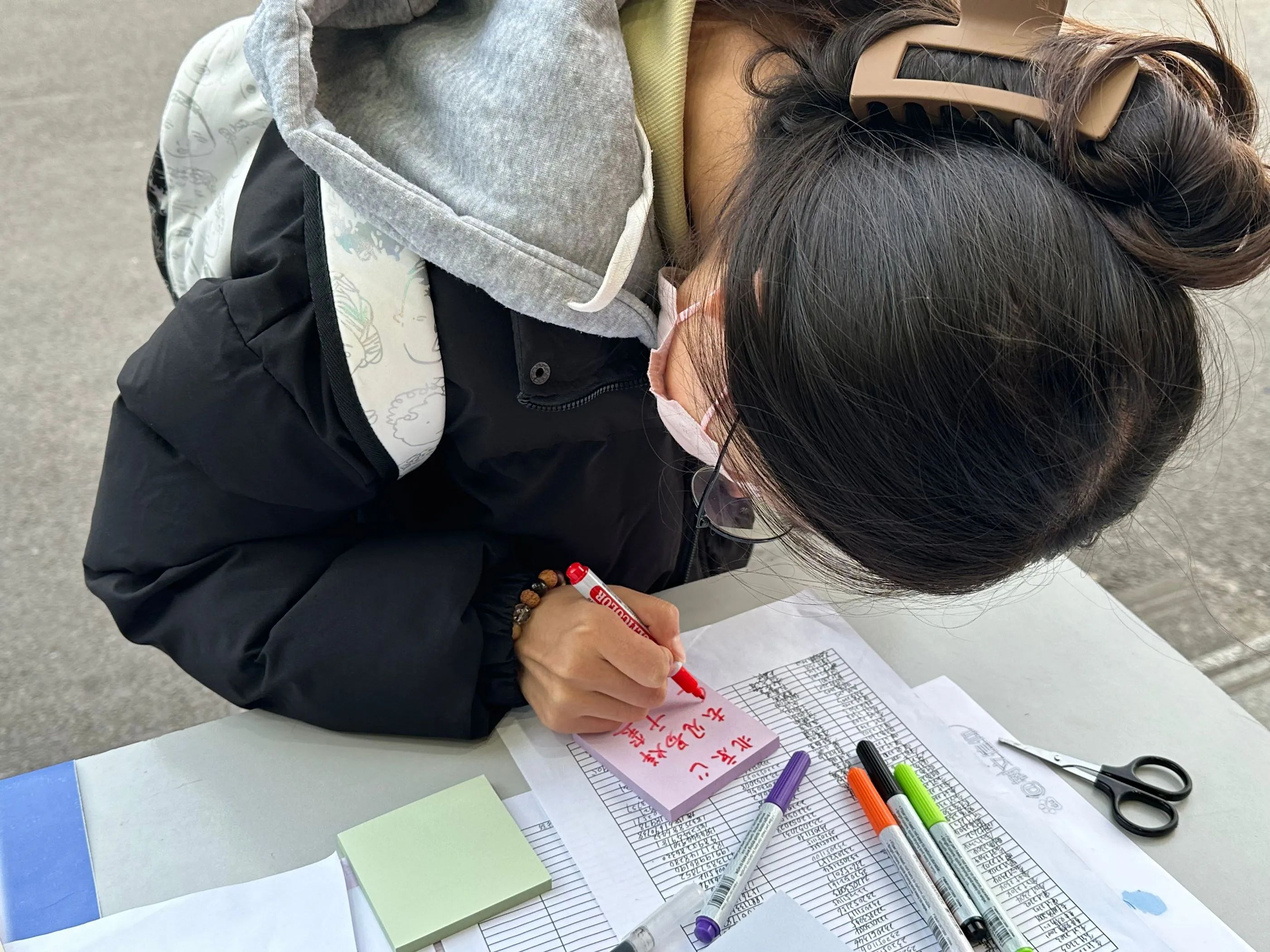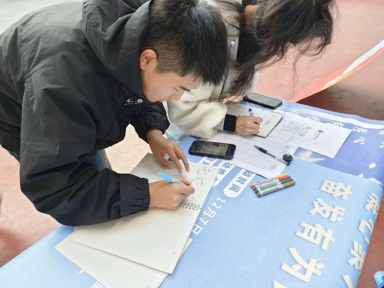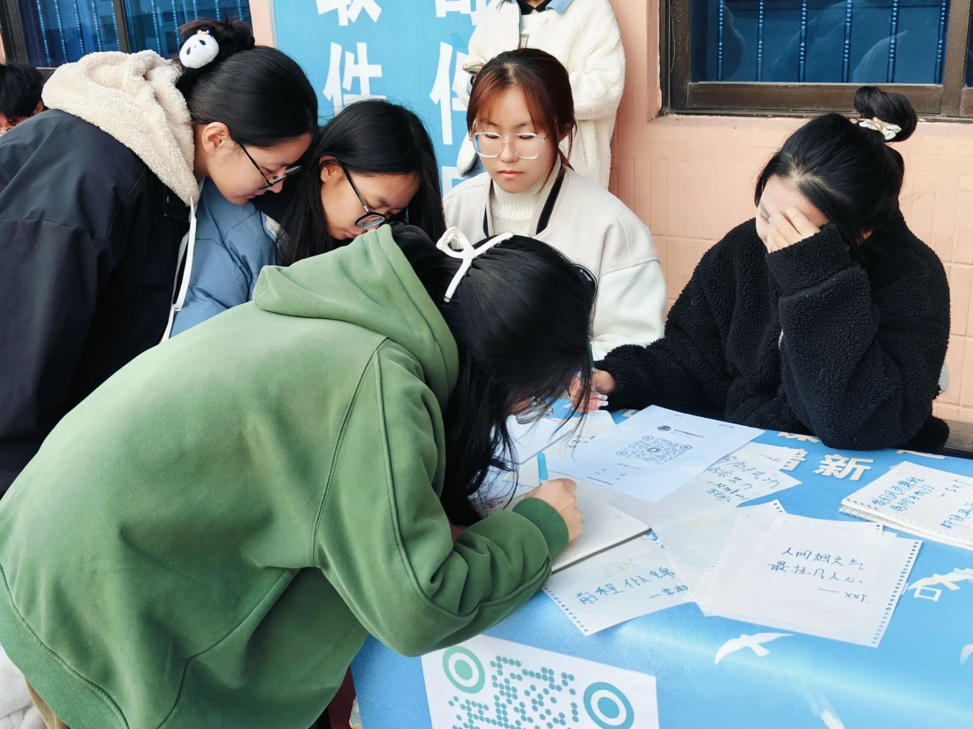 本次活动分为“读万卷书”和“行万里路”两阶段。活动伊始,同学们在工作人员的引导下填写活动表格,随后在站点设置的“书”中写下自己心中最惊艳的文章美句并署名。