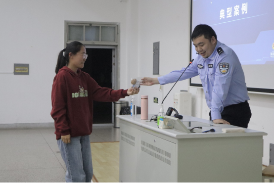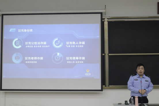 紧接着,警官具体讲解了电信诈骗的多种形式,包括刷单、网恋、裸聊、冒充身份等,并结合典型案例让同学们切身感受到了诈骗手段的多样狡猾。针对部分团伙的低价促销诈骗和假冒公检法的电话诈骗,警官告诫同学们一定要及时和相关部门进行核验,仔细辨别是非真假,切勿轻信他人。